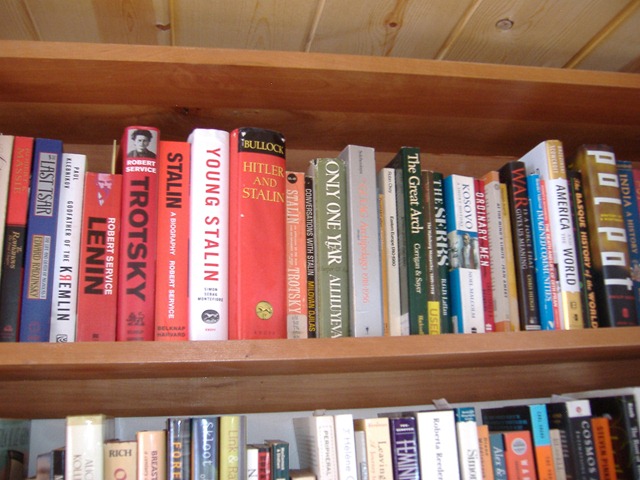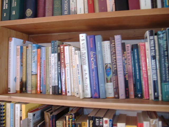 of people’s bookshelves, and I had to post a comment about that. Which shelf should I send a picture of? The one containing books about Russian history? Arthurian arcana? General mythology? Native American history and religion? Comparative religion and early Christianity? Psychology and brain science? Physics? Children’s literature? Serial killers? Science fiction? Writing advice? American literature? International literature, organized by country? The relationship books? The ones on grief? Poetry?