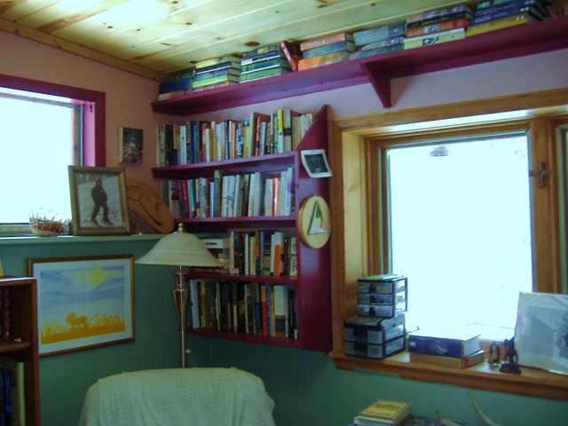 Then there are the bookshelves themselves. The ones built in to my study walls—thrown up in a hurry by my brother after a long remodel project when he really needed to be elsewhere. Montana, in fact. These shelves didn’t turn out the way I imagined them, but when I look at them, I remember how hard the two of us worked to make my new house livable after my wrenching divorce, how much I needed my brother’s support, how torn he was because he loved my husband at least as much as he loved me, how much he helped me despite his anger at me, and how tired we both were as we came to the end.