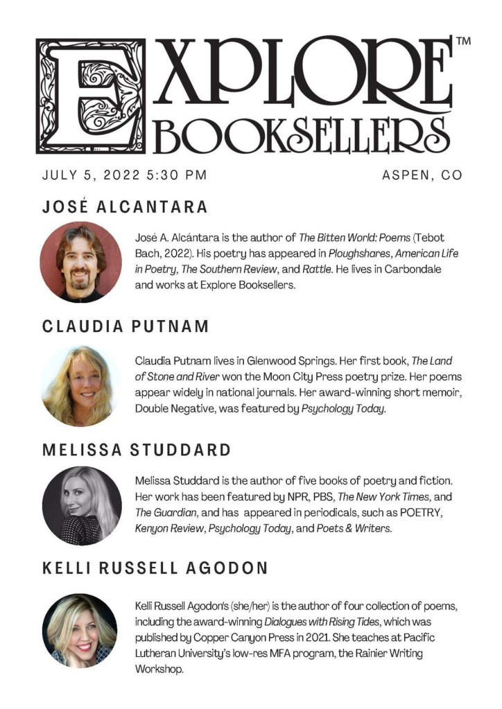 POETRY READING: Excited to read in-person with Jose A. Alcantara, Melissa Studdard, and Kelli Russell Agodon at Explore Booksellers in Aspen, July 5, at 530 PM.