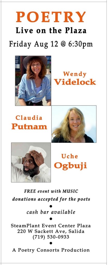 POETRY READING: Live at the SteamPlant Plaza in the artsy little mountain town of Salida, CO. 630 PM, Friday 8/12. Cash bar. With Wendy Videlock and Uche Ogbuji.