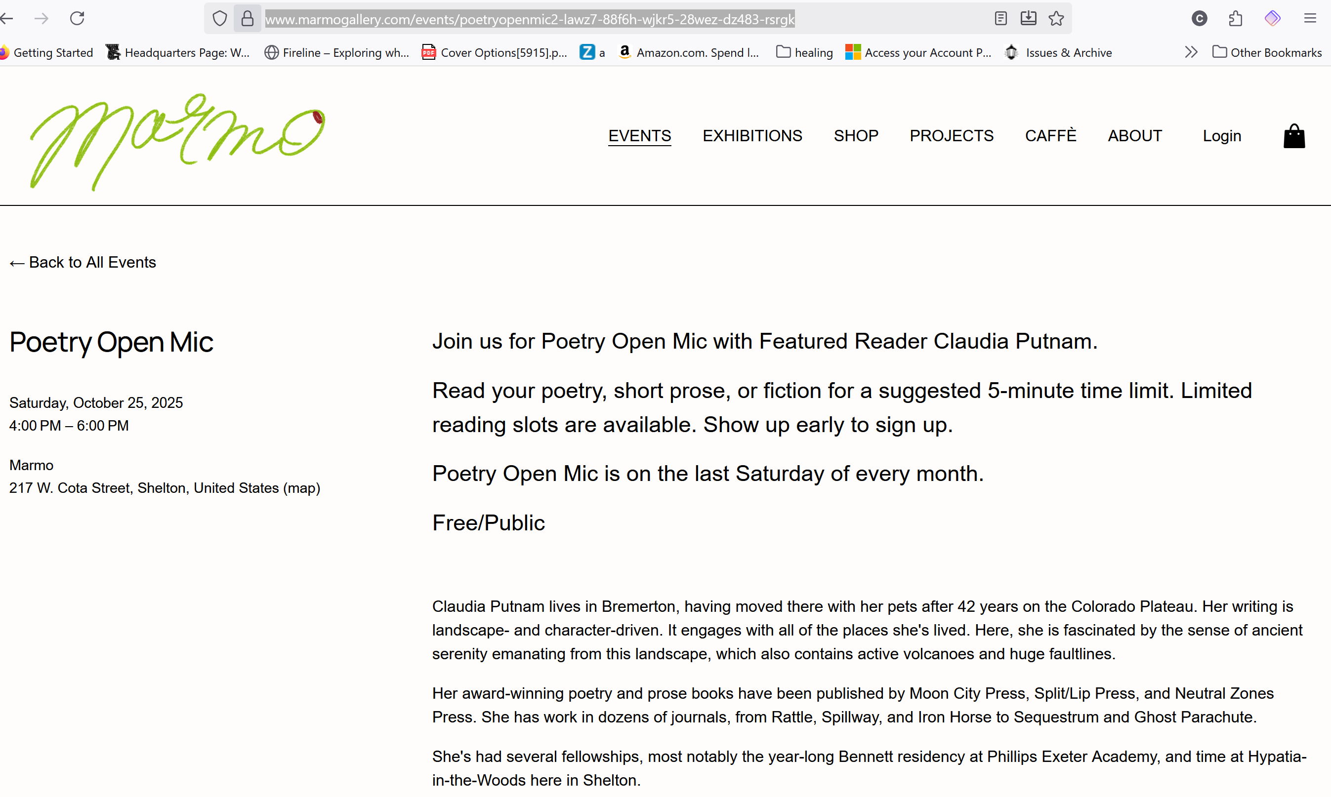 POETRY READING: It’s been a while since I’ve been able to do a public reading. So glad I was invited to be the featured reader at this wonderful open mic tradition! Marmo Gallery, in Shelton, WA, is a cornerstone of the artistic community in this region. Worth checking out for its own sake. And the food is awesome! Sat, 10/25, 4 PM. more info: marmogallery.com/events